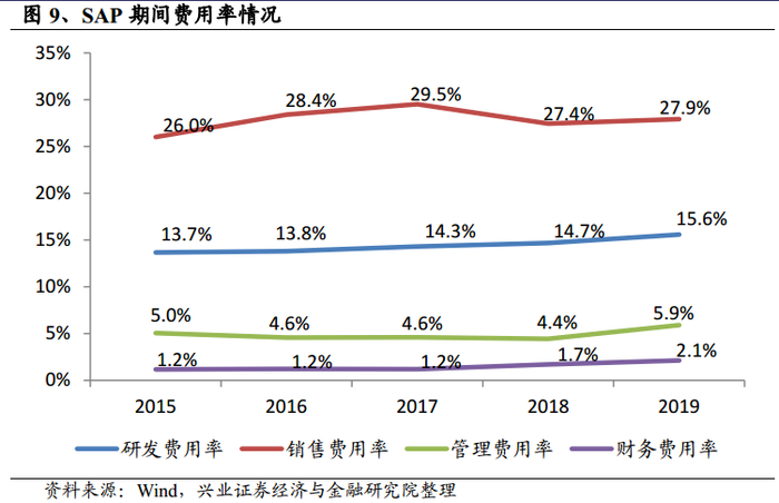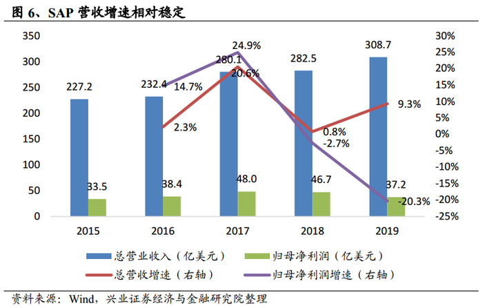 近三年营收保持稳健增长。2019年,SAP实现营收规模309亿美元,同比增长9.3%,近三年复合增速达9.9%,公司营收保持稳健增长;实现净利润规模37.2亿美元,同比下降20.3%,近三年复合增速为-1.1%,主要系营销及研发期间费用提升所致。