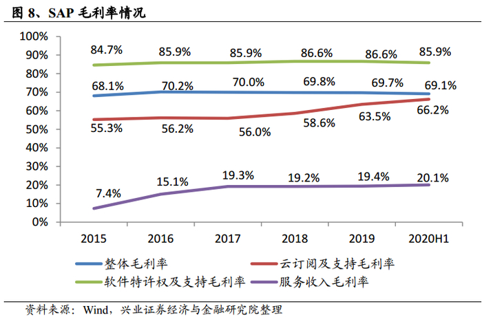 云收入成营收核心增长点,云服务收入占比逐渐提升。云收入成营收核心增长点,云服务收入占比逐渐提升。2017至2019年SAP云订阅及支持服务收入45.0亿、57.1亿、77.7亿元,同比增长42.9%、26.9%、36.1%,近8年云相关收入增速皆高于总收入增速,云收入增长为营收核心增长点,2018年云收入占总营收比重为20%,2019年占比25.16%,2020年上半年占比30.83%,云业务贡献收入比重持续提升,预计未来云收入将持续发力。