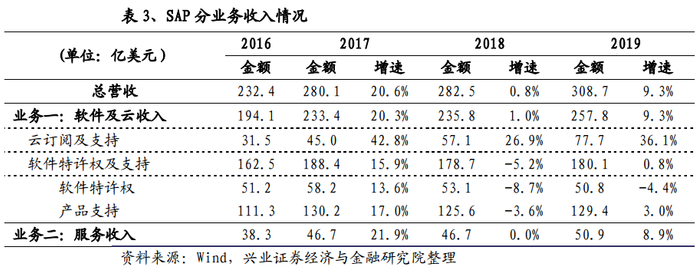 SAP收入结构由云订阅及支持、软件特许权及支持、服务收入三部分构成。2019年三部分营收分别为77.7亿、180.1亿、50.9亿美元,同比增长36.1%、0.8%、8.9%。其中,软件特许权及支持收入可继续拆分为软件特许权、产品支持收入,2019年两部分业务收入分别为50.8亿、129.4亿美元,同比变动-4.4%、3.0%。