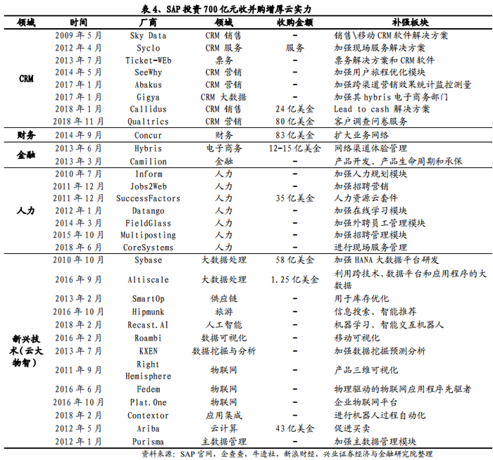大举收并购投资超700亿美元,重点补充CRM、人力及新兴技术。SAP的云转型动力及相关技术高速发展离不开外延并购策略。过去十年间,SAP在技术上投资高达700亿美元,先后收购了Hybris、SuccessFactors、Ariba、Concur、Fieldglass、Qualtrics等垂直领域解决方案商,集中补强CRM、人力及新兴技术(数据处理为主)领域,在HANA平台及云ERP上补短板并逐步扩充业务范围。