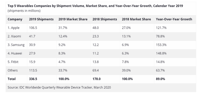 第二个原因可能是为了与小米、华为、Fitbit等友商竞争。IDC发布的全球2019年可穿戴市场报告显示,2019年全球可穿戴设备出货量达到3.365亿台,比2018年的1.78亿台增加了89%。