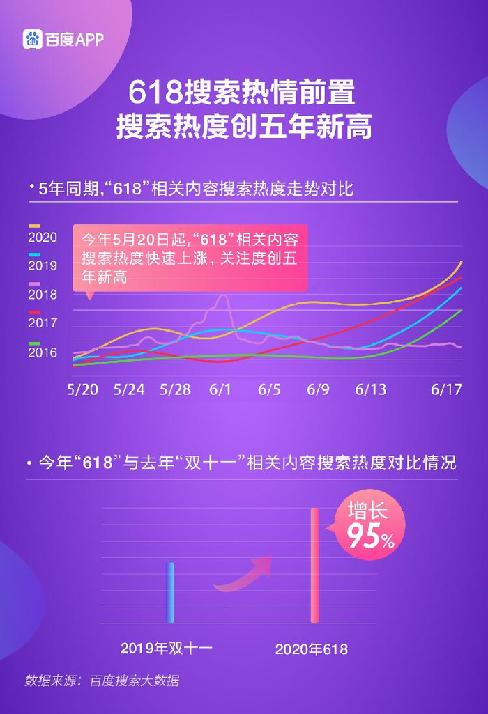 这是百度今年布局电商的又一次尝试,今年618期间百度上线了“618”频道,推出了“好物奇遇季”等知识直播电商玩法。《百度618电商搜索大数据报告》显示,今年“618”的搜索热度创五年新高,较去年双十一增幅高达95%。