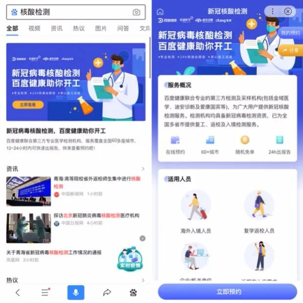 事实上,早在今年4月,百度健康就上线了“核酸检测”服务预约,覆盖北上广等60多个城市居民,在百度搜“百度健康”,进入百度健康小程序或百度搜索“核酸检测”即可进入服务页面预约检测,在线下检测后24小时内获取线上电子报告。