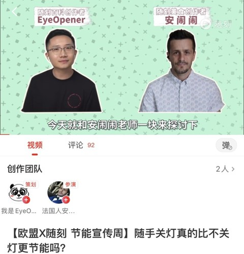 另一次经历则是在节能宣传周与另一名随刻美食类创作者“法国人安闹闹”的联动,在随刻的牵线和欧盟的支持下,两人共同创作了一期有关“节能减排宣传”的公益内容。“任何一个垂类创作者,都要想方设法与不断加速的观众审美疲劳做对抗,”EyeOpener告诉品玩,与安闹闹的合作让他看到了自己在内容创作选题和形式上的更多可能,“能够在随刻上发布独家定制内容这件事本身对我和我现在的团队来说都是一种非常大的激励,这是对我们创作能力的一种直观肯定。”