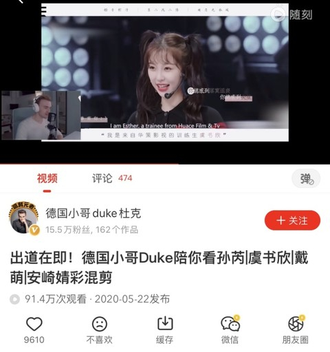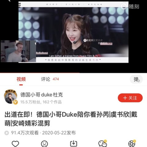 “我觉得应该抓住这个机会。”Duke告诉品玩,一直有想法进入中国市场的他意识到自己的机会来了,《青春有你2》是爱奇艺的原创IP,恰好刚起步的随刻又十分鼓励新兴创作者,于是Duke很快答应了随刻的邀约,开始在随刻以“德国小哥duke杜克”的名字发布视频,双方第一阶段的合作便是关于《青春有你2》。