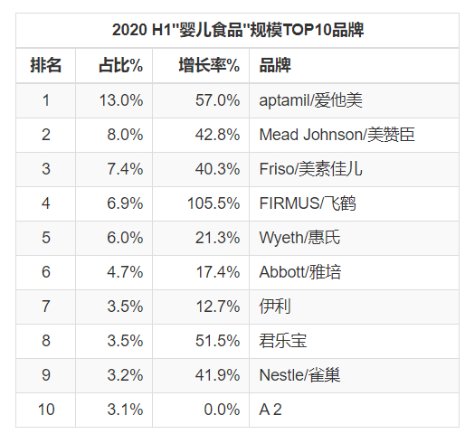 而从线上市场来看,爱他美、美素佳儿、美赞臣、惠氏等品牌长年占据了大部分的线上市场份额,ECdataway 数据威数据显示,2020上半年在婴儿食品TOP10品牌中,爱他美、惠氏、a2等外资奶粉品牌占据了七个位置,且爱他美份额最大,占比13.0%,增速也较快,达57%。