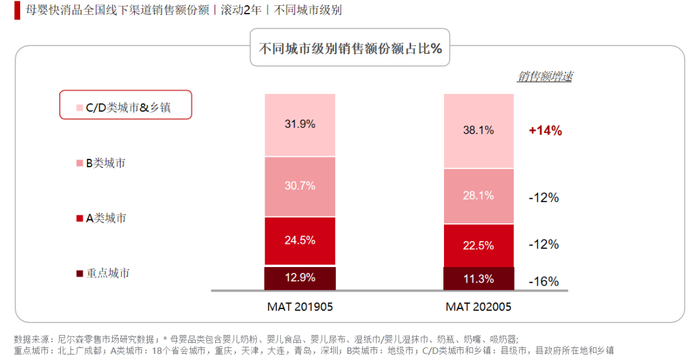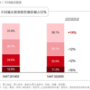 在近两年,全渠道布局一直都是趋势,但在2020年之前,很多奶粉品牌虽然也开始重视线上渠道,但还是坚持走线下销售的路线,尤其是国产品牌,把发力重心还是放在线下母婴店,其中将求增量空间的目光转向下沉市场,当然当下下沉市场的增速仍为显著,还有较大的发展空间,《报告》指出,截至2020年5月,整个母婴快消品类在低线城市及乡镇的销售额占比为38.1%,同比增长14%,而其他上线城市的增速均在下滑,尤其是北上广、成都等重点城市,下滑最为严重。