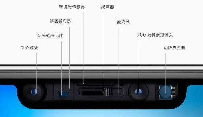 iPhone的刘海之所以那么大,是因为其内部包含了很多元件。从下方的结构图可以看出,iPhone刘海内部的元器件包括红外镜头、泛光感应元件、距离感应器、扬声器、麦克风、前置摄像头以及点阵投影器。正因如此,才使得iPhone实现了人脸解锁、拟我表情等功能。