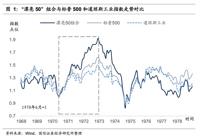 这里再放一张来自国信证券研究所的「漂亮50」和美股大盘的历史走势对比: