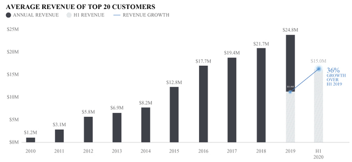 另一方面,单个客户对公司的营收贡献占比高,这极大增强了业绩表现可能因某一大客户撤单而出现暴跌的风险。Palantir在其招股书中提到,该公司的前三大客户在2018年贡献了其营收的33%,在2019年贡献了28%,在今年上半年贡献了29%,基本都在近三分之一的水平线上。
