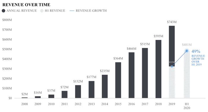 Palantir一半以上的收入来自于CIA(也是早期投资者)等政府机构的保密数据合同。2019年Palantir营收增长25%至7.426亿美元。2020年上半年营收同比增长49%,达到4.812亿美元。