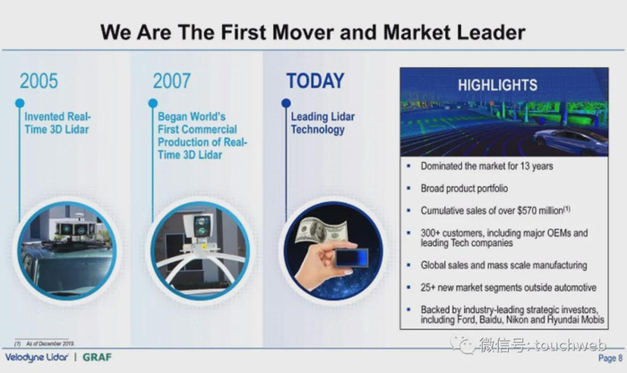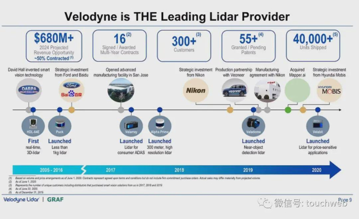 2016年8月,Velodyne获得福特和百度1.5亿美元投资;2018年12月获得尼康2500万美元投资;2019年10月获得现代5000万美元投资。