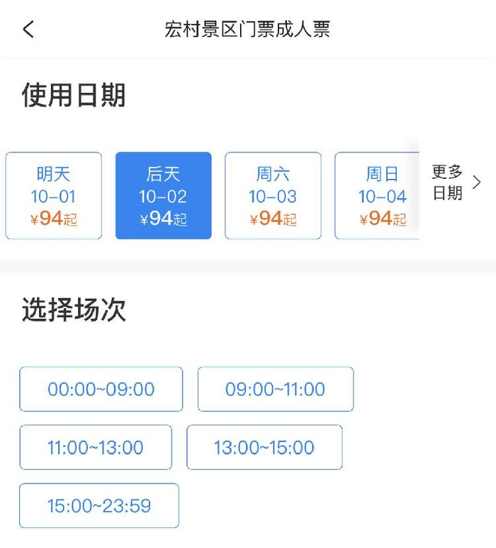 在预约服务上,携程提供了线上预约、分时预约、扫码预约等服务,游客可以充分利用线上渠道来进行景区预约。分时预约服务以安徽宏村景区为例,游客在购买门票时,可以在选择日期之后,选择入园时间,并在规定时间入园。