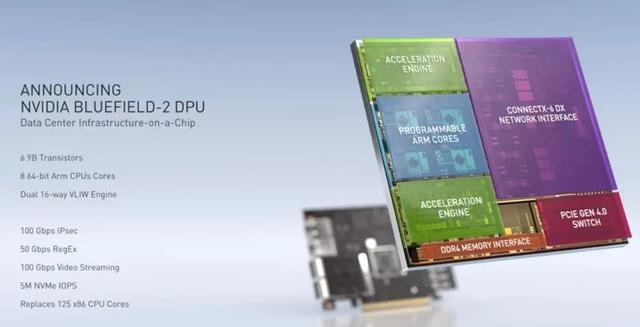 其中,BlueField-2集成了8颗64位Arm-Cortex A72内核,拥有2个超长指令字(VLIW)加速引擎,以及两个100Gb/s的网络通道(MellanoxConnectX 6 Dx NIC),在网络性能和存储性能上有诸多亮点,并且提供了更多硬件安全功能,包括无代理微分段、高级恶意软件检测、深度包检测和应用程序识别,远远超过了纯软件解决方案。英伟达称,一颗BlueField-2 DPU可以替换125颗x86处理器。