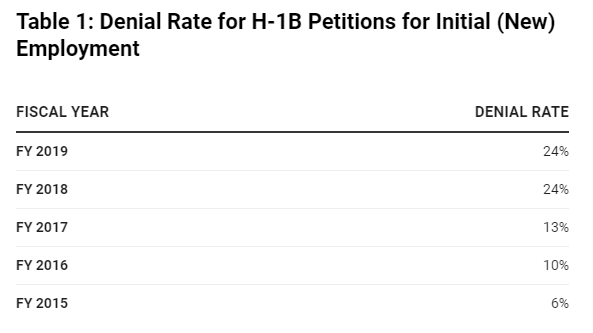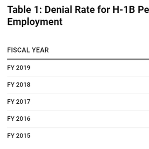 美国移民局(USCIS)的数据显示,2019财年H-1B工作签证首次申请拒签率高达32%,而奥巴马政府时期的2016财年只有10%。2019财年的H-1B延期申请的拒签率也高达12%,而2016财年仅有4%。而复审率则从2015财年的22.3%一路飙升到47.2%,意味着几乎一半的H-1B申请都会被要求提供更多证明文件,而复审之后的批准率目前也只有67%,意味着三个复审申请必有一个被拒签。