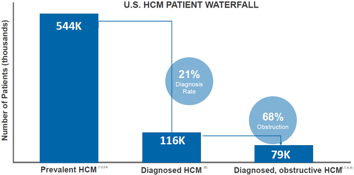 BMS的CEO Giovanni Caforio在电话会议上,坚称仅凭mavacamten在梗阻性HCM方面的前景,即可证明收购MyoKardia是合理的。Caforio博士认为梗阻性HCM适应症是一个“几十亿美元的机会”。每500人中就有1人患有HCM,使其成为最常见的遗传性心血管疾病。在美国和欧盟,目前约有16-20万人被诊断为有症状的梗阻性HCM,据估计只有约25%的梗阻性HCM患者和约10%的非梗阻性HCM患者得到了诊断。以美国为例,估计HCM患者有54.4万例,但是诊断率仅有21%。可以预见,随着诊断率的提升,HCM治疗市场的容量将会进一步增长。(图表3)