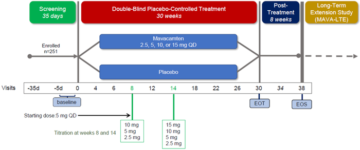 Mavacamten的前景在今年8月的欧洲心脏病学会大会(ESC Congress)上,MyoKardia公布了mavacamten的关键性III期临床试验EXPLORER-HCM(NCT03470545)30周的结果。251例有症状梗阻性HCM患者被1:1随机分成两组,在30周内每日口服一次mavacamten或安慰剂。全部患者满足以下入排标准:LVOT梯度≥50mmHg、NYHAclass II-III(纽约心脏协会II-III级)症状、LVEF(左心室射血分数)>55%,允许背景用药。患者最初每天接受5mg的剂量,在第8周和第14周有两次机会根据心脏健康的血药浓度测量将剂量调整到2.5mg和15mg之间。(图表4)