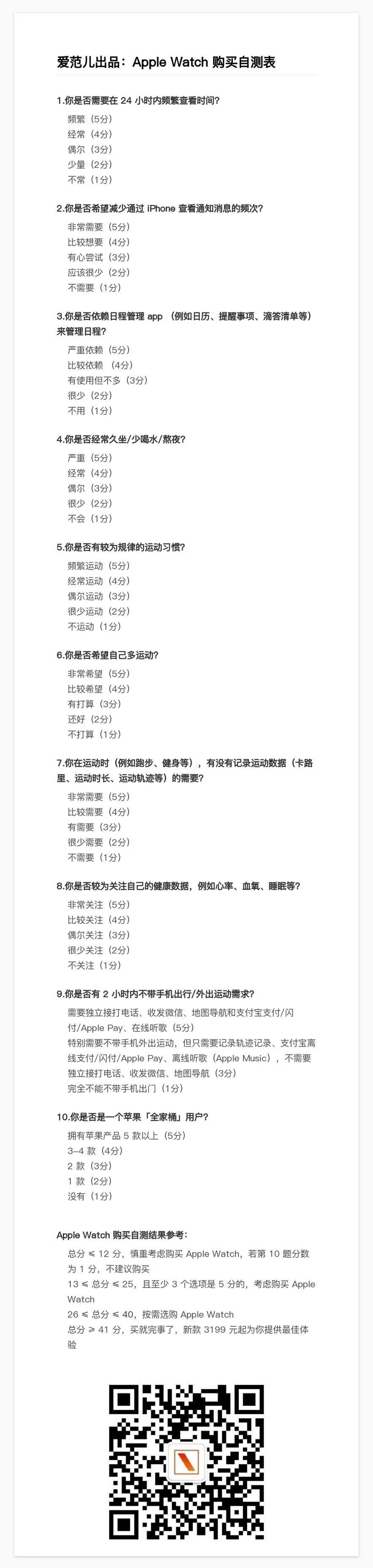 为了帮助大家迅速做购买决策,我们专门制作了一个自测表,大家只需要花几分钟就可以初步了解自己需不需要 Apple Watch,建议保存到相册。