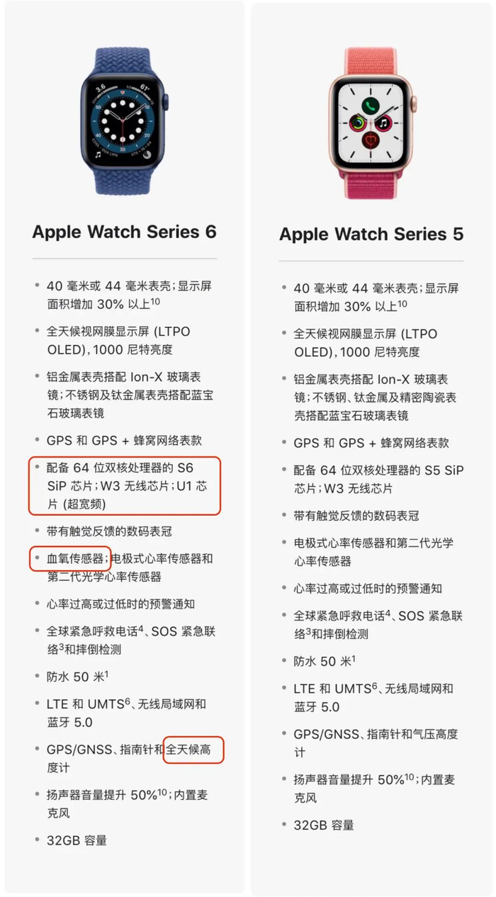 总结起来,Apple Watch S6 和 S5 相比,增加了血氧检测功能,处理器在 S5 的基础上快了 20% 左右,屏幕低功耗全天显示情况下亮了 2.5 倍,多了 U1 芯片,高度计升级为全天候监测,其它方面差别不大