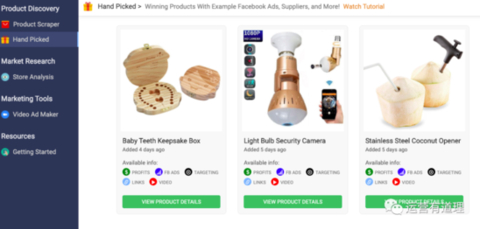 能看到产品的供应商、亚马逊售卖的店铺、FB广告、在Youtube的视频