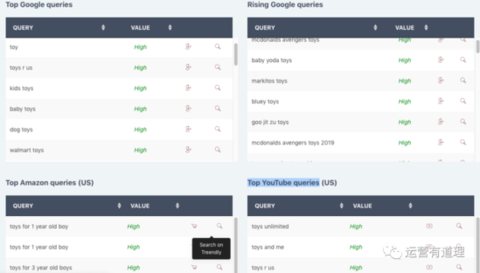 支持在“Top Google queries、Rising Google queries、Top Amazon queries和 Top YouTube queries”之前来回嵌套查询,比较方便。
