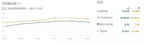 从访问数量来看,近6个月的数据中显示NOON整体流量是要低于阿联酋亚马逊的,平均访问时长也短于亚马逊,页面访问次数更低,但是跳出率差距不大。