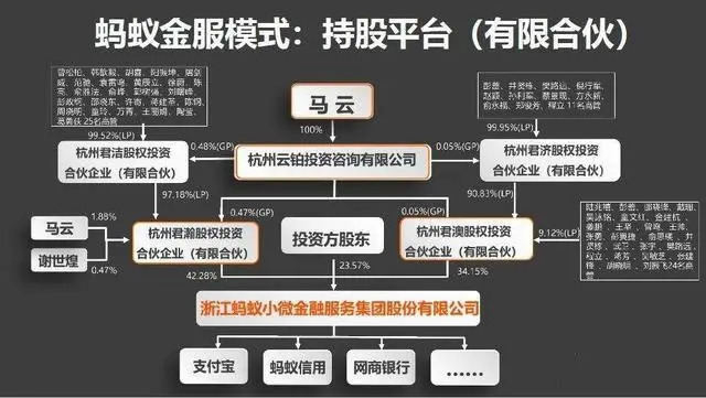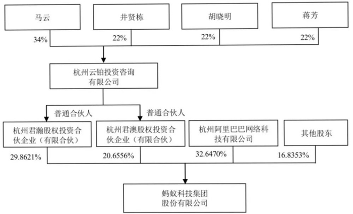 在回复上交所的问询时,蚂蚁集团表示:其实际控制人是马云。蚂蚁集团的控股股东是杭州君瀚和杭州君澳两个有限合伙企业,为员工持股平台,分别持有29.86%和20.66%的股权。杭州君瀚和杭州君澳的普通合伙人及执行事务合伙人为杭州云铂。马云通过100%控制杭州云铂间接控制了蚂蚁集团50.52%的股份,为蚂蚁集团实际控制人。