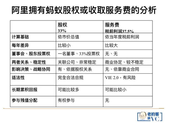 阿里为什么选择蚂蚁集团33%股权,以“交换”(放弃)未来每年收取蚂蚁税前利润37.5%服务费以及IPO时的巨额现金回报。我用上述的图表,从八个层面,来探讨入股与拿取“服务费”的差别。有关分析,可参考公众号“老约客谈VC”:“试论阿里入股蚂蚁金服而放弃服务收入”, 2019/11/2