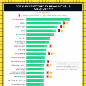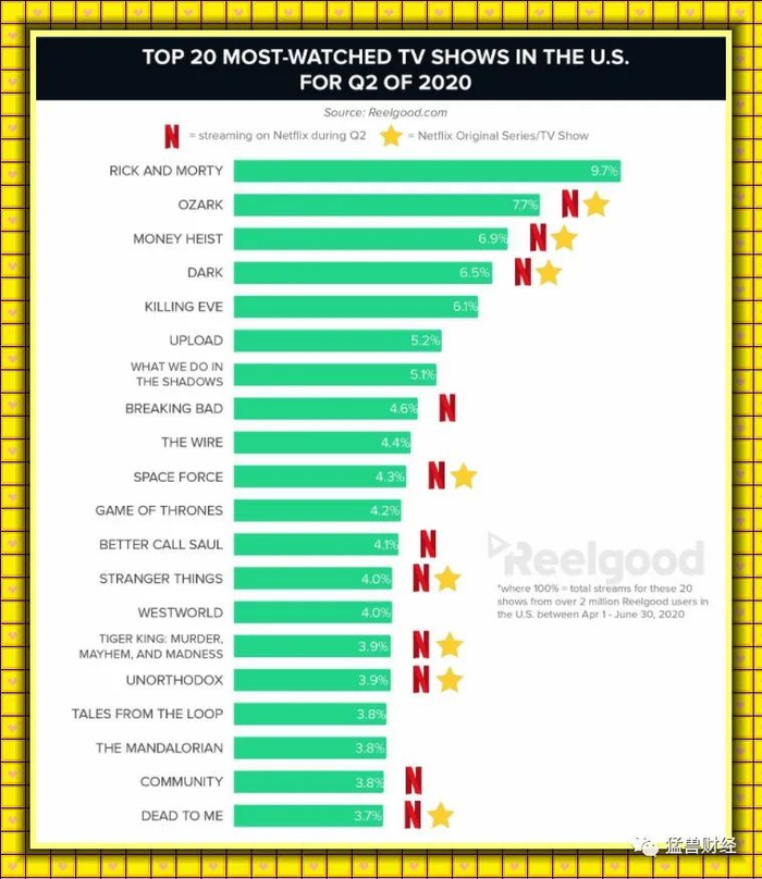 我们根据美国视频搜索引擎Reelgood统计的200万用户(2020年4月1日- 6月30日)数据显示:在美国20部收视率最高的电视剧中有11部是在Netflix上播出的,其中8部是Netflix原创电视剧。