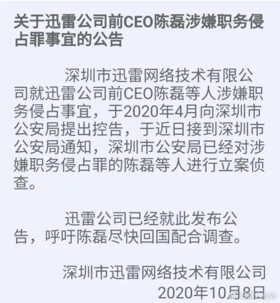 公告中说:迅雷公司前CEO陈磊等人涉嫌职务侵占事宜,于2020年4月向深圳市公安局提出控告,于近日接到深圳市公安局通知,深圳市公安局已经对涉嫌职务侵占罪的陈磊等人进行立案侦查。