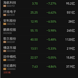 10月14日,A股苹果概念股全天表现低迷。截至收盘,环旭电子(601231.SH)跌超6%;歌尔股份(002241.SZ)跌逾5%;蓝思科技(300433.SZ)收跌3.35%。板块42只个股中,仅有4只上涨。