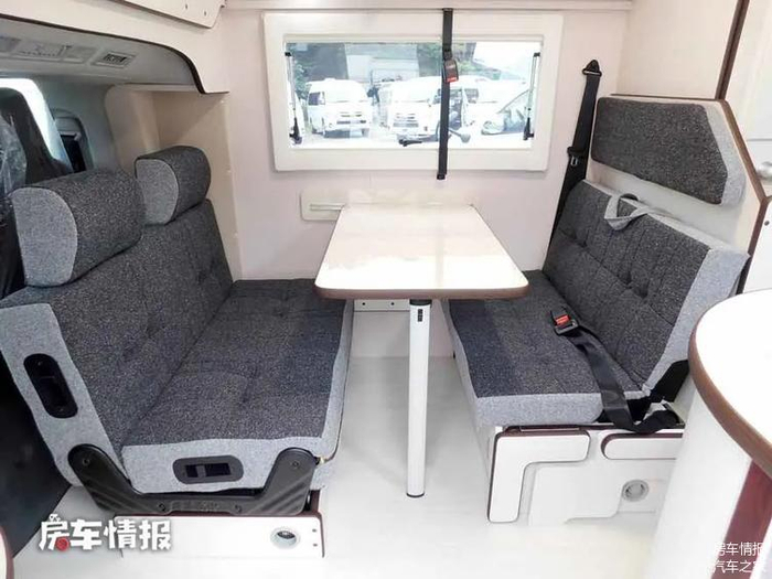 除了尾部上下床,车厢前部的四人卡坐沙发也可以拼成一张尺寸约为1850*1100mm的双人床,满足一大一小休息没有问题。