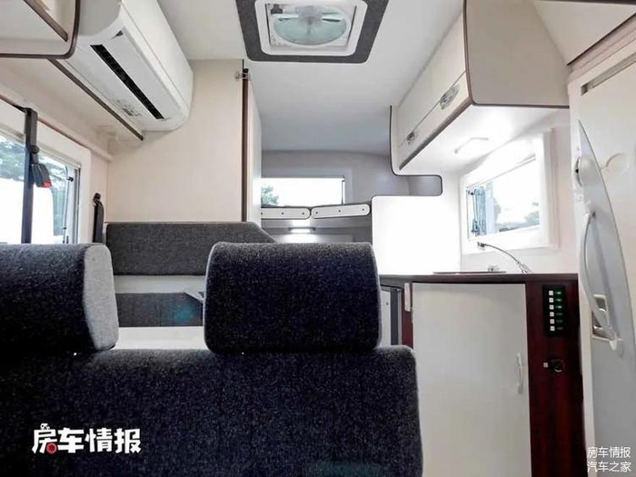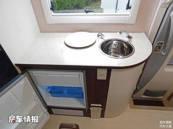 车厢另一侧提供了一组厨房设备,不过受限于尺寸仅提供了冰箱、洗菜池以及部分橱柜,没能提供更多其它灶具,这也是日系房车的一贯设计特点,如果想要做饭的话可以自备一套便携式卡炉,使用也挺方便。