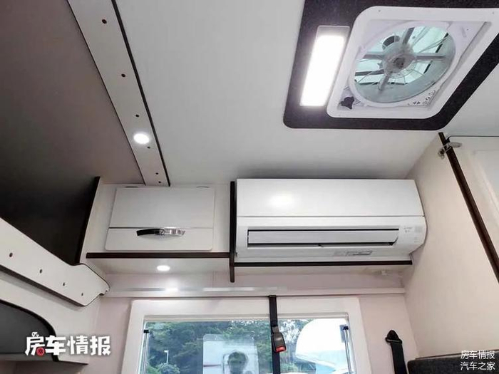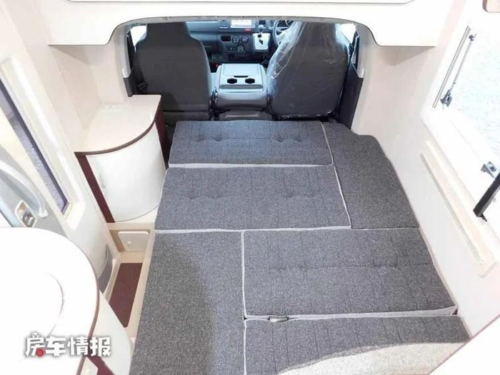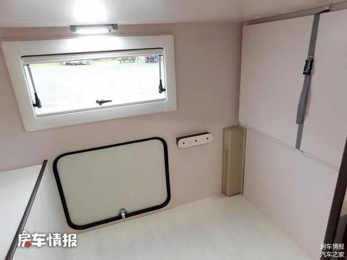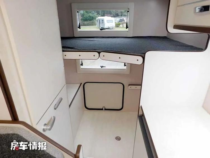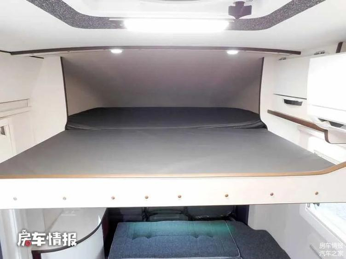 车顶还提供了一张升降床,尺寸挺大的,达到了1850*2000mm,顶部双人床能这么大,是因为床降下来以后,刚好和驾驶室顶部的额头床拼接到一起,这样就变成了一张超大床,需要注意的是在不打开升降床的情况下,额头床尺寸太小只能作为储物空间使用。