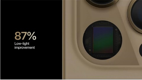 iPhone 12 Pro Max也进一步构建了相机系统。有新的1200万像素长焦镜头,焦距为65mm,可以光学放大到2.5倍。还有新的广角摄像头,f/1.6光圈和新的sensor-shift OIS光学防抖系统。广角传感器也是大了47%, 这与较低的光圈相比,带来87%更好的低光性能。