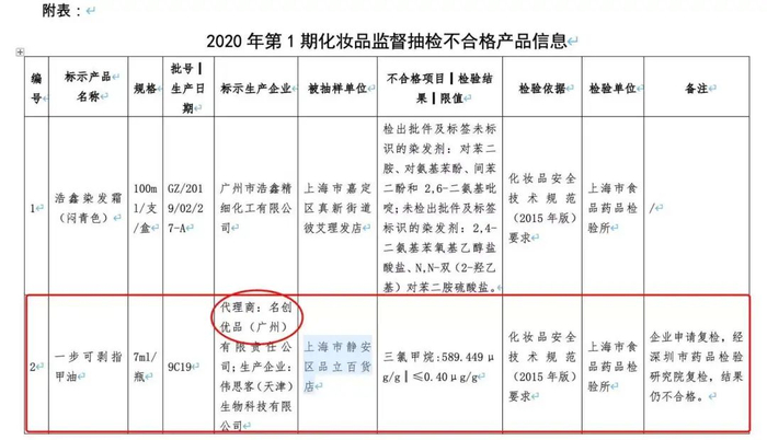 今年六月,名创优品售卖的一款餐具被爆三聚氰胺超标,半个月前又被曝出指甲油致癌物超标1400倍,还一度登上了微博热搜。有公开信息显示,药监局对该产品的复检结果仍为不合格。