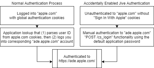 我们花时间入侵的第一个服务器之一是"苹果杰出教育家"网站。这是一个仅限邀请的Jive论坛,用户可以使用他们的苹果账户进行认证。这个论坛的有趣之处在于,一些注册应用的核心Jive功能是通过苹果公司建立的自定义中间件页面移植过来的,以便将他们的认证系统(IDMSA)与使用用户名/密码认证的底层Jive论坛连接起来。