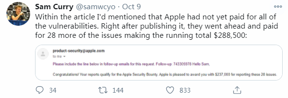 在国外媒体vice对这件事进行报道后不久,其中一名黑客Sam Curry就在个人推特上表示,苹果告诉他们,他们还有机会获得总计28.85万美元的奖励,因为之前苹果只为部分漏洞付了钱,现在,他们准备再追加28个漏洞的奖金。