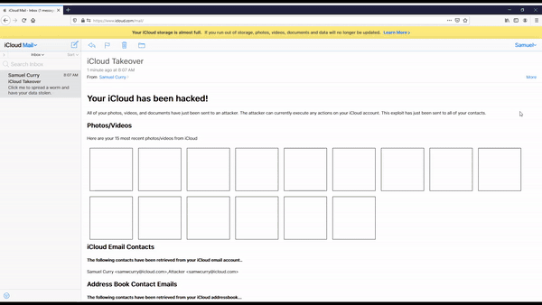 以下视频展示了一个概念的证据,一个受害者的照片被盗。在由恶意方执行的充分利用场景中,攻击者可以悄悄地窃取受害者的所有照片、视频和文档,然后将修改后的电子邮件转发给受害者的联系人列表,并对iCloud邮件服务实施跨站点脚本有效载荷蠕虫攻击。
