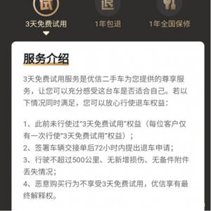 据了解,优信二手车平台上所有在售车辆均享受“三天免费试用”权益,且退车条件也是相当简单且厚道:行使不超过500公里、无新增损伤、无备件附件丢失;签署车辆交接单后72小时内提出退车申请;未行使过“三天免费试用”权益;非恶意购买行为。消费者可以充分感受这台车是否适合自己,再决定是否购买,优信不收取任何退车费用,是“真·免费试用”。