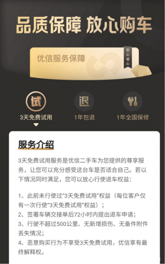 对比多个平台发现,一些平台推出的三天无理由退车、七天无理由退车大部分为营销噱头,暴露出诸多问题,如收高额管理费、拉长退车流程等增加退车门槛,让退车成为空头支票。相比之下,中国二手车电商第一股优信最近推出的三天免费试用活动简单无套路。