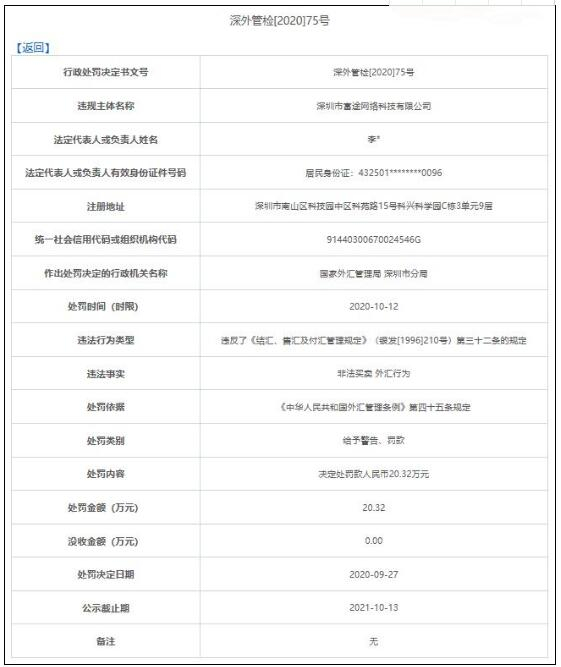 国家外汇管理局一份10月12日的行政处罚显示,富途证券因非法买卖外汇行为违反了《结汇、售汇及付汇管理规定》第三十二条的规定,外汇局深圳分局根据《外汇管理条例》相关规定对富途证券给予警告并罚款。