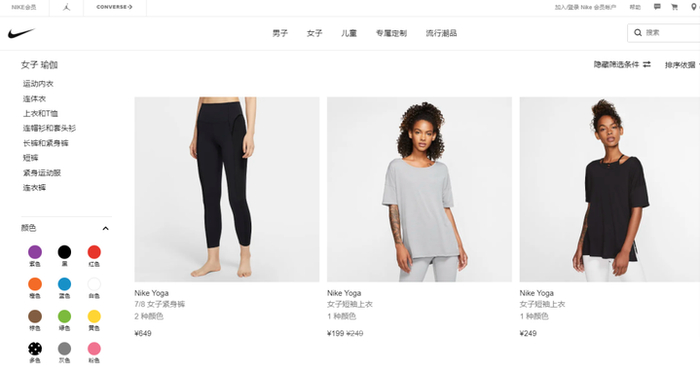 2015 年前后,Nike、Adidas 等运动品牌都开始注重女性运动消费市场,研发瑜伽运动产品。例如 Nike 不仅在 2019 年年初推出了单独的瑜伽产品线,并且拿出了比 lululemon 更具诱惑力的价格——Nike 瑜伽线服装价格多集中在 200—500 元的范围之间。