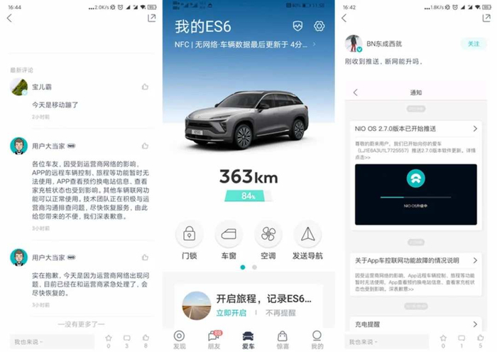 蔚来的断网问题,有不少车主反映过。@电池不胖表示在老版本里面,开几十公里遇到基站切换的时候,就会更容易断网,「更新 2.7 之后好像好了很多」。