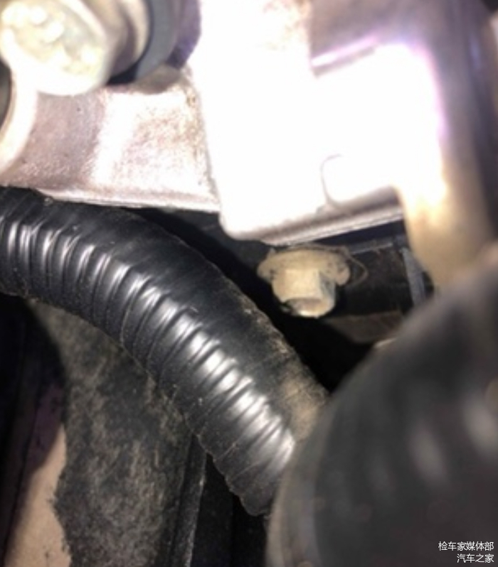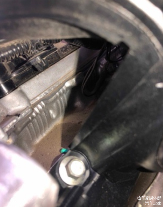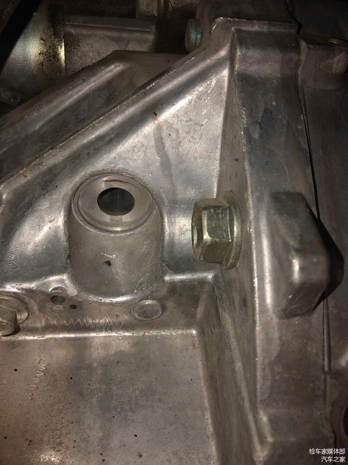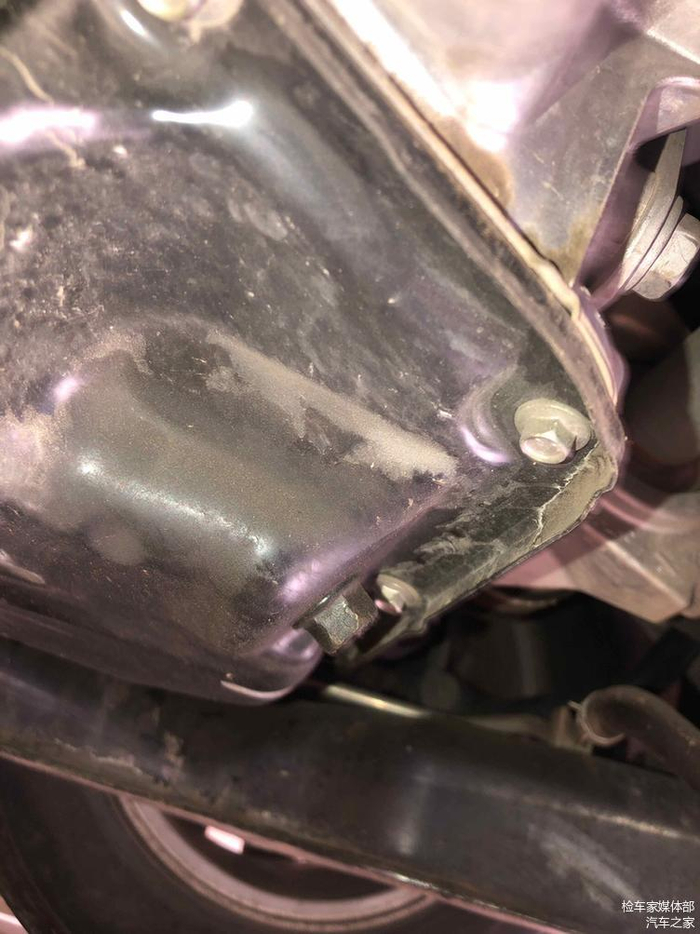检测发动机与变速箱结合出螺丝,无拆卸痕迹发动机曲轴后油封无渗油漏油痕迹,检测到这里基本底盘就检测完了。