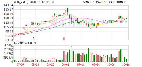 14日发布会结束后,由于缺乏惊喜,苹果股价一度跌近4%,截至收盘,跌2.65%,报121.1美元,市值2.07万亿美元。