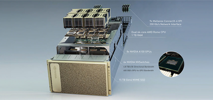 每个NVIDIA A100系统使用600 GB/s NVSwitch链路连接8个A100 GPU,配备320 GB超大内存,带宽为每秒12.4 TB。
