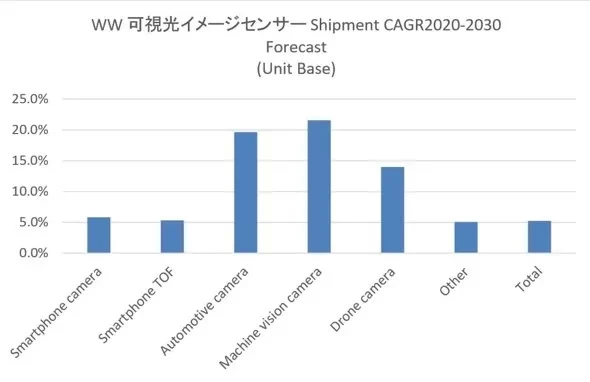 如上所述,在图像传感器市场中,手机方向占了八成左右,起决定性作用,从增长率来看,又是另一番景象!尤其引人注目的是汽车、工业设备、无人机三个领域,OMDIA表示,2020年-2030年期间的CAGR分别为19.6%、21.6%、14.0%,增长极其迅速。