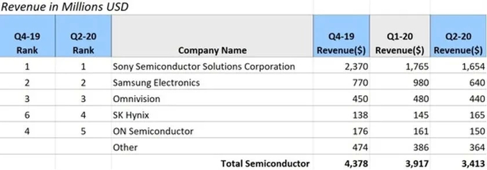 主要图像传感器厂家的2019年第四季度—2020年第二季度的销售额推移。