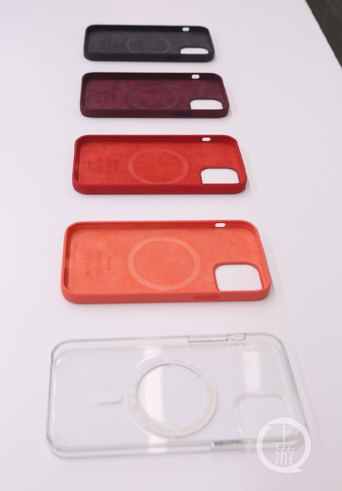 在此次体验会上,苹果还展示了几款官方配套手机壳。最大的变化则是在背部加入了圆形的线圈。“这是为了配合Magsafe无线充电所设计的。”苹果销售人员介绍,在装上手机壳后,屏幕就会出现一个动画来显示Magsafe已准备好,可以直接隔着手机壳来为手机无线充电。